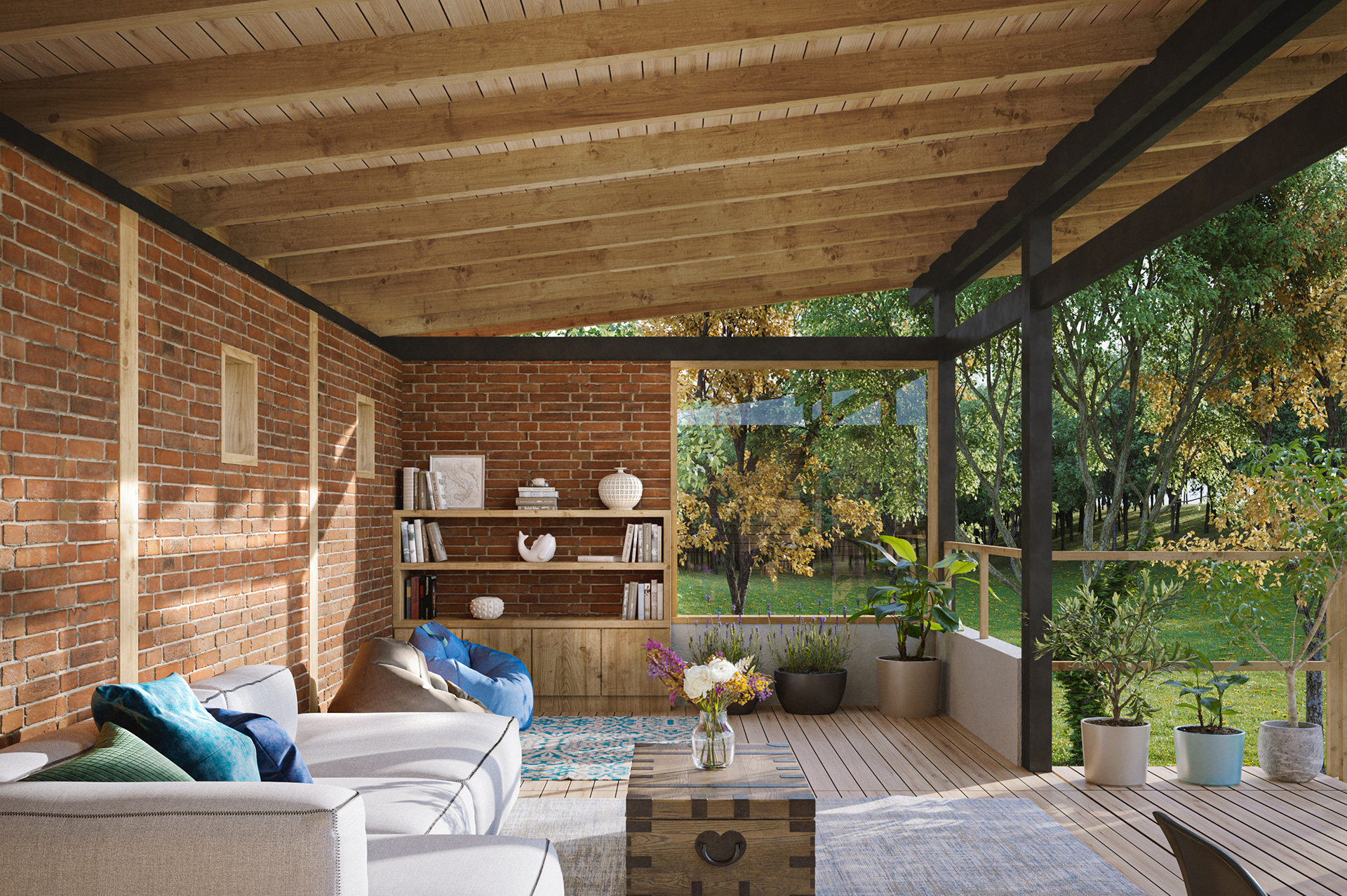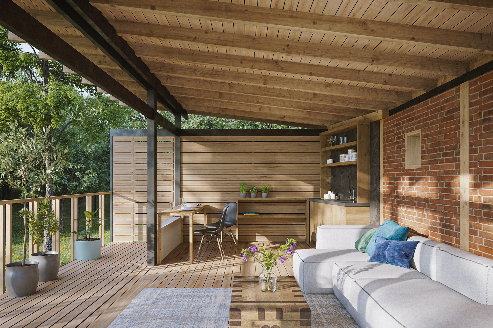 2 images. 3D render of a terrace designed in a Boutique Hotel. Tepoztlan - Mexico Design: Sebastián Granda. Status: in construction Software used: AutoCAD, 3Ds Max,, Corona render, Forest Pack and Photoshop.