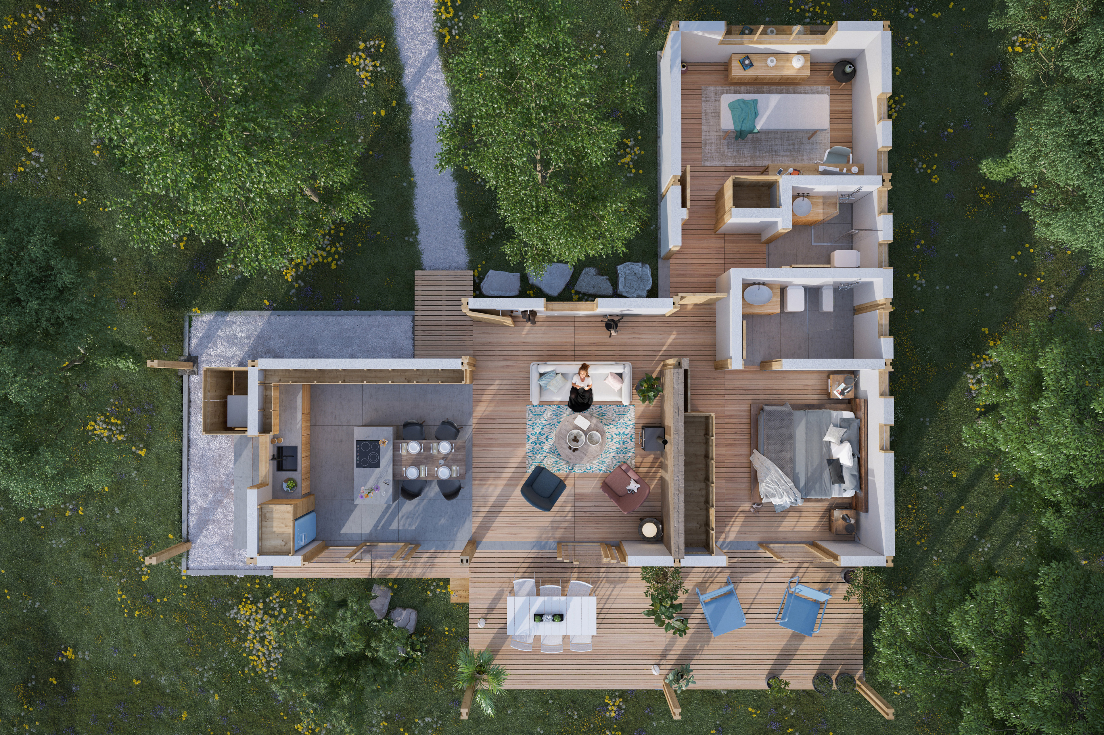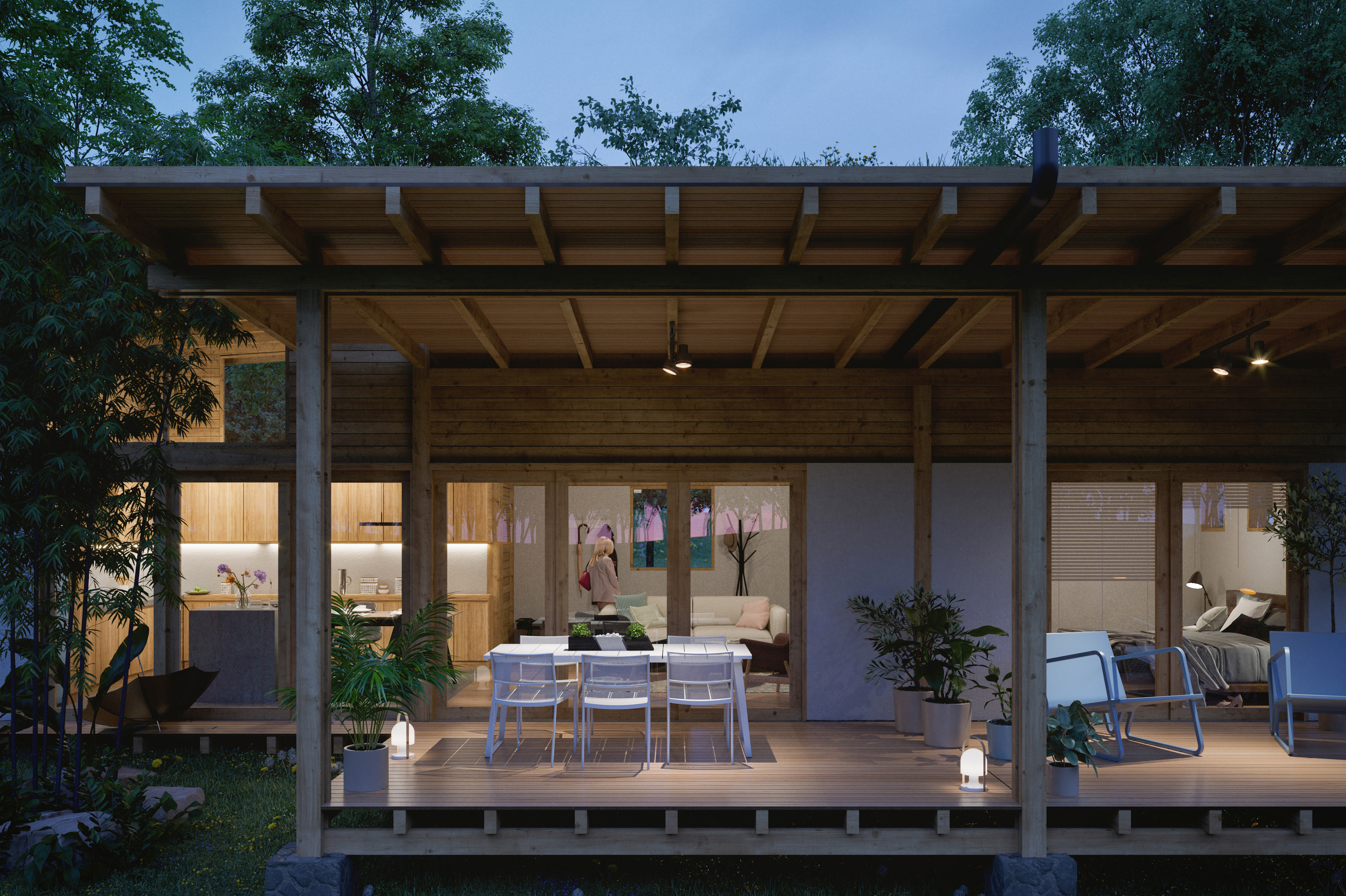 2 images. 3D render of a house designed with natural and sustainable materials and features. Tumbaco - Ecuador. Design: Sebastián Granda. Status: buit Software used: AutoCAD, 3Ds Max, Corona render, Forest Pack and Photoshop.